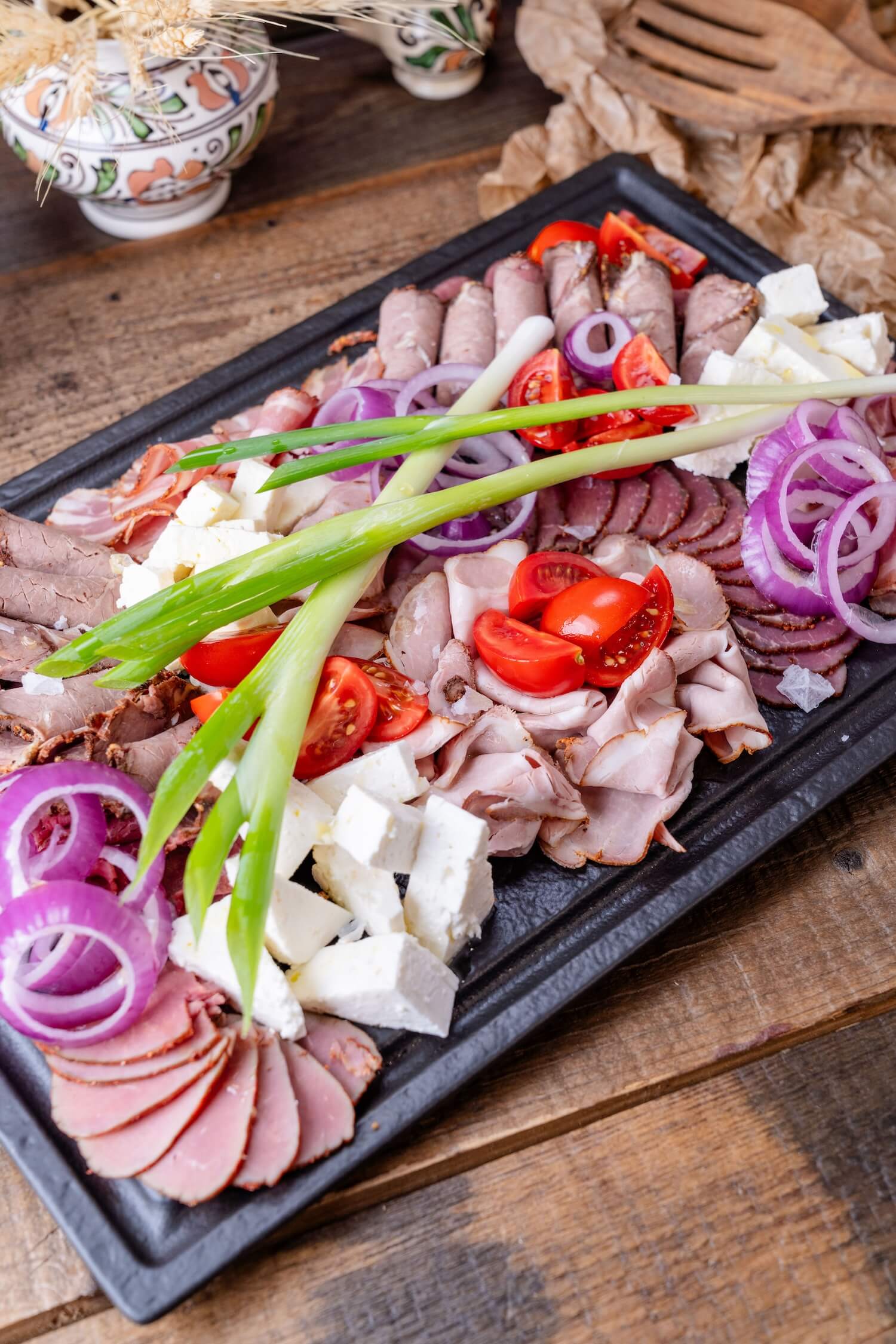 – Bacon, pork cracklings, Euphoria salami, Euphoria sausages, pork knuckle, brined cheese from sheep milk, brined cheese from cow milk, crackling cream, vegetable stew (zacuscă), cherry tomatoes, green onions, hot peppers, red onion